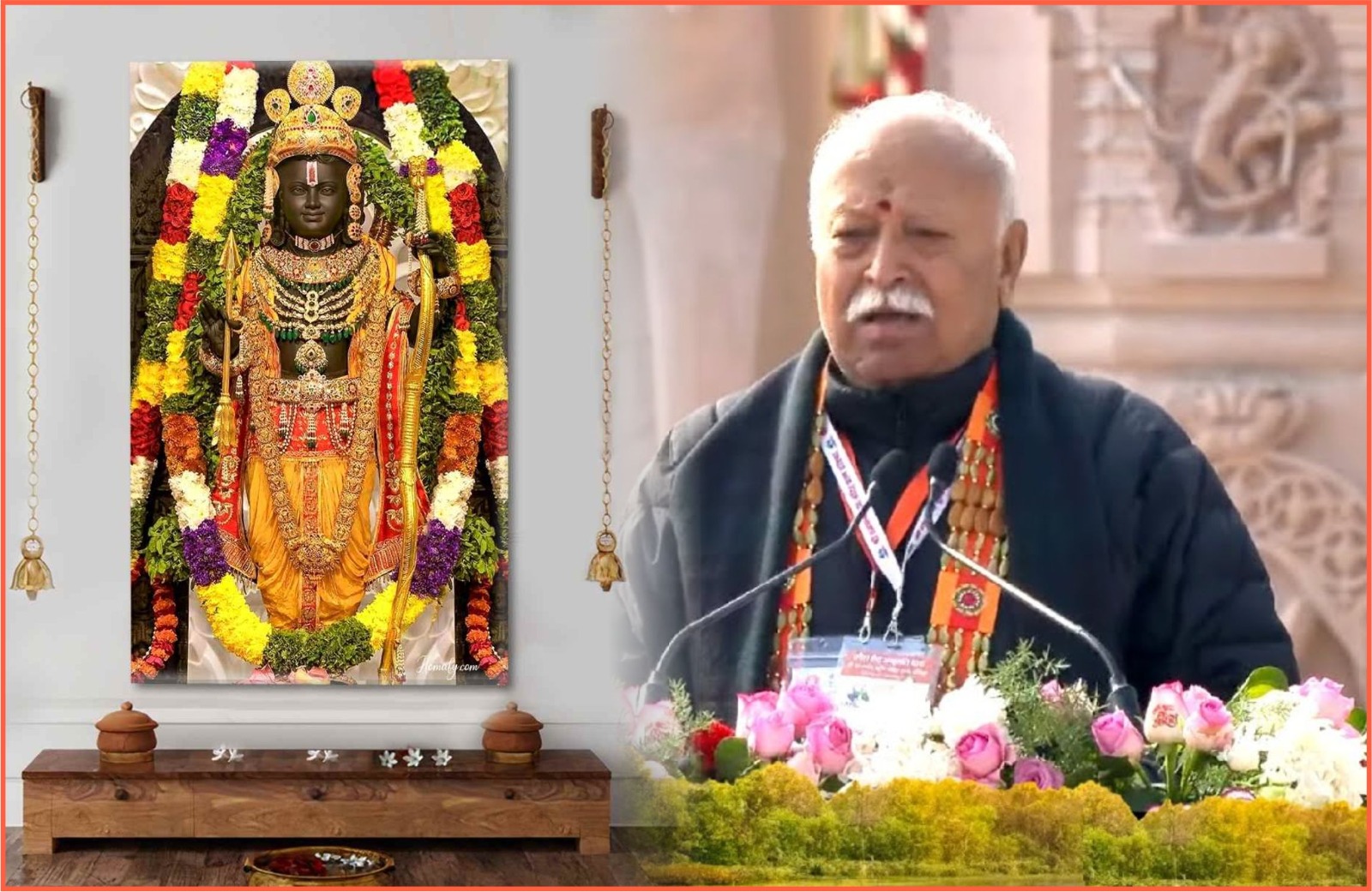 अयोध्या में 22 जनवरी 2024 को भगवान रामलला के प्राण प्रतिष्ठा समारोह में राष्ट्रीय स्वयंसेवक संघ के सरसंघचालक डॉ. मोहन भागवत जी ने अपने संबोधन में कहा कि यह आनंद शब्दों में वर्णनातीत है और उसके वर्णन करने का प्रयास इसके पहले के वक्तव्यों में अच्छा हो गया। यह भी बता दिया गया है और हम जानते भी हैं कि आज अयोध्या में रामलला के साथ भारत का स्व लौट आया है। और संपूर्ण विश्व को त्रासदी से राहत देने वाला एक नया भारत खड़ा होकर रहेगा। इसका प्रतीक यह कार्यक्रम बन गया है। ऐसे समय में आपके उत्साह का, आपके आनंद का वर्णन कोई नहीं कर सकता। हम यहां पर अनुभव कर रहे हैं कि देशभर में भी यही वातावरण है। छोटे-छोटे मंदिर के सामने दूरदर्शन पर इस कार्यक्रम को सुनने वाले हमारे समाज के करोड़ों बंधु वहां पहुंच ना पाए ऐसे घर-घर के हमारे नागरिक, सज्जन, माता, भगिनी सब भावविभोर हैं। सब में आनंद है सब में उत्साह है और ऐसे समय में जोश की बातों में थोड़ी सी होश की बात करने का काम मुझे ही दिया जाता है। आज हमने सुना कि इस प्राण प्रतिष्ठा महोत्सव में पधारने के पूर्व प्रधानमंत्री जी ने कठोर व्रत रखा। जितना कठोर व्रत रखने को कहा था उससे कई गुना अधिक कठोर व्रताचरण उन्होंने किया।