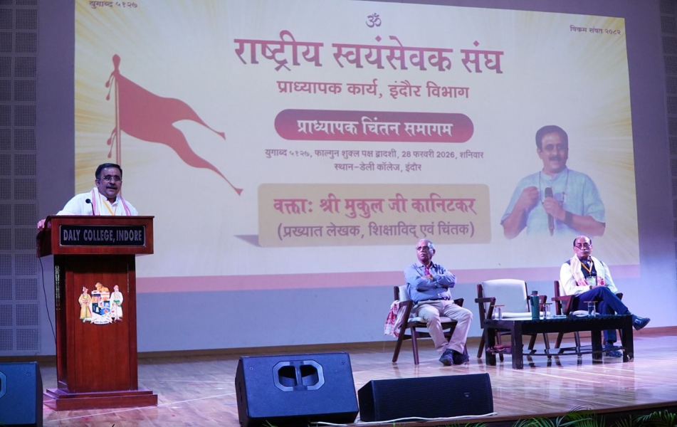 कार्यक्रम के मुख्य वक्ता मुकुल कानिटकर ने संघ के 100 वर्षों की गौरवशाली यात्रा का उल्लेख करते हुए राष्ट्र निर्माण के लिए व्यक्तित्व निर्माण के महत्व पर प्रेरक विचार साझा किए। उन्होंने कहा कि हम सभी प्राध्यापक सौभाग्यशाली हैं, जिन्हें समाज में व्यक्तित्व निर्माण का दायित्व मिला है। प्राध्यापक ही राष्ट्र निर्माण के आधारस्तंभ हैं। कार्यक्रम की अध्यक्षता प्रकाश जी शास्त्री, प्रांत संघचालक ने की। मुख्य अतिथि के रूप में दिलीप कुमार पटनायक उपस्थित रहे।