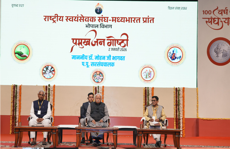 भोपाल। संघ शताब्दी वर्ष के निमित्त भोपाल में आयोजित ‘प्रमुख जन गोष्ठी’ में राष्ट्रीय स्वयंसेवक संघ के सरसंघचालक डॉ. मोहन भागवत जी ने कहा कि हमारे मत-पंथ, सम्प्रदाय, भाषा, जाति अलग हो सकती है। लेकिन हिन्दू पहचान हम सबको जोड़ती है। हम सबकी एक संस्कृति और धर्म है। हम सबके पूर्वज समान हैं।