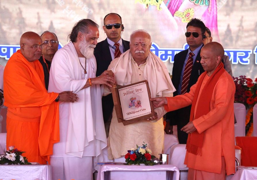 उत्तर प्रदेश के मुख्यमंत्री योगी आदित्यनाथ ने कहा कि, भारत का हर सनातन धर्मावलम्बी व्यक्ति गीता के 18 अध्याय और 700 श्लोक को आत्मसात करके बड़े ही श्रद्धा भाव से पढ़ता है। हमने धर्म को केवल उपासना विधि नहीं माना है, बल्कि धर्म हमारे यहाँ जीवन जीने की कला है। हम हर कर्तव्य को धर्म के भाव से करते हैं। हमने अपनी श्रेष्ठता का डंका कभी नहीं पीटा। अन्याय नहीं होना चाहिए। जीओ और जीने दो की सोच होनी चाहिए। युद्ध कर्तव्यों के लिए लड़ा जाता है। जहाँ धर्म होगा, वहीं विजय होगी। अपने धर्म पर चलकर कार्य करना चाहिए। अधर्म के साथ कोई भी कार्य करने से नाश ही होता है। फल की चिन्ता मत करो, निष्काम कर्म की प्रेरणा कृष्ण जी ने दी है। योगी जी ने कहा कि, राष्ट्रीय स्वयंसेवक संघ अपनी शताब्दी महोत्सव के कार्यक्रम से जुड़ रहा है दुनिया के लिए कौतूहल औऱ आश्चर्य का विषय है। दुनियाभर से विभिन्न देशों के एंबेसडर आते हैं और वे हम लोगों से पूछते हैं क्या आप लोगों का संघ से जुड़ाव है। हम लोग कहते हैं हाँ, हम लोगों ने स्वयंसेवक के रूप में कार्य किया है। वे पूछते हैं कि, इसका फंडिंग पैटर्न क्या है। हमने कहा फंडिंग पैटर्न नहीं है। 'ओपेक' {OPEC} देश संघ को पैसा नहीं देते हैं। यहाँ कोई इंटरनेशनल चर्च पैसा नहीं देता है। यहाँ समाज के सहयोग से संगठन खड़ा हो रहा है। संगठन, समाज के प्रति अपने आपको समर्पित करते हुए हर एक क्षेत्र में कार्य करता है। कोई भी पीड़ित आएगा उसकी सेवा अपना कर्तव्य मानकर एक-एक स्वयंसेवक करता है। बिना यह परवाह किए कि किस जाति, मत, मजहब, क्षेत्र, भाषा का है उसकी सेवा करनी है। उसके साथ खड़ा होना है। यह कर्तव्य मानकर सेवा को किसी सौदे के साथ नहीं जोड़ते हैं। राष्ट्रीय स्वयंसेवक संघ की यही शिक्षा है कि राष्ट्र प्रथम भाव के साथ राष्ट्र के अन्दर हर उस पीड़ित की मदद करना है जो भारत को परम वैभव तक ले जाने में सहायक हो सकता है। उसके साथ खड़ा हो जाना है यही राष्ट्रीय स्वयंसेवक संघ की प्रेरणा है। जिसने सेवा के साथ पिछले सौ वर्षों में कोई सौदेबाजी नहीं की लेकिन कुछ लोगों ने दुनिया और भारत में भी सौदे का माध्यम बनाया है।
