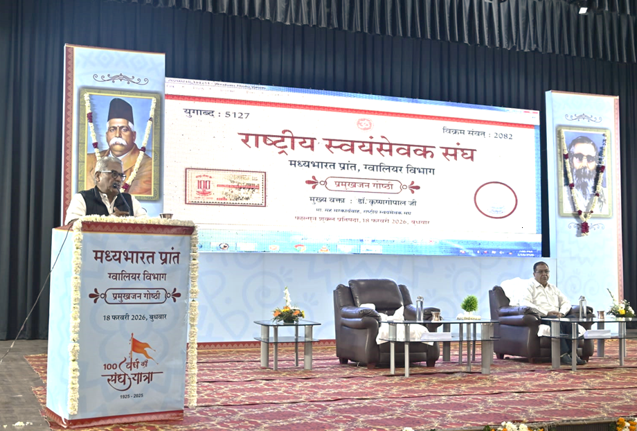 राष्ट्रीय स्वयंसेवक संघ ग्वालियर विभाग द्वारा आयोजित गोष्ठी में विभाग संघचालक प्रहलाद सबनानी भी मंचासीन रहे। डॉ. कृष्ण गोपाल जी ने संघ की 100 वर्ष की यात्रा पर विस्तार से प्रकाश डाला। उन्होंने कहा कि किसी भी संगठन के लिए शताब्दी वर्ष महत्वपूर्ण बात है। आज संघ की समाज में स्वीकार्यता बढ़ी है, लेकिन संगठन को सभी लोग निकटता और गहराई से समझें, इसलिए शताब्दी वर्ष में कार्यक्रम आयोजित किए जा रहे हैं। संघ की व्यक्ति निर्माण के माध्यम से राष्ट्र निर्माण की कार्यपद्धति पर आज जर्मनी, रूस सहित 50 देश शोध कर रहे हैं।