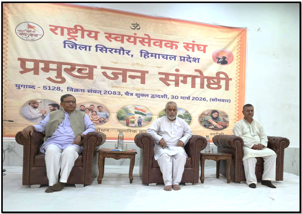 संघ शताब्दी वर्ष के निमित्त राष्ट्रीय स्वयंसेवक संघ, जिला सिरमौर द्वारा गुरु नगरी पांवटा साहिब में प्रमुख जन गोष्ठी का आयोजन किया गया। कार्यक्रम का शुभारंभ वंदे मातरम् से हुआ। राष्ट्रीय स्वयंसेवक संघ के अखिल भारतीय सह-प्रचार प्रमुख प्रदीप जोशी जी मुख्य वक्ता के रूप में उपस्थित रहे।