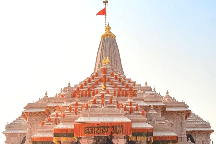 500 वर्षों की प्रतीक्षा अब समाप्त हो चुकी है। जी हां अयोध्या में बने भव्य श्री राम जन्मभूमि मन्दिर के शिखर पर आज धर्म ध्वज लहराई गई । अभिजीत शुभ मुहूर्त में प्रधानमंत्री नरेंद्र मोदी ने 22 फीट लंबे, 11 फीट चौड़ी और लगभग 3 किलो वजनी इस विशेष धर्म ध्वजा का ध्वजारोहण किया। इस ऐतिहासिक कार्यक्रम में उत्तर प्रदेश के मुख्यमंत्री योगी आदित्यनाथ, राष्ट्रीय स्वयंसेवक संघ के सरसंघचालक डॉ. मोहन भागवत जी, राज्यपाल आनंदीबेन पटेल समेत देशभर से आए हजारों श्रद्धालु मौजूद थे। ध्वजारोहण से पहले प्रधानमंत्री मोदी ने सप्तमंदिर में जाकर सप्त ऋषियों के दर्शन किए और भगवान श्रीराम की आरती उतारी। पूरी अयोध्या आज एक दिव्य और भव्य उत्सव का साक्षी बनी, जिसमें आस्था और इतिहास एक साथ जीवंत हो उठे। इस अवसर पर विशेष बात यह थी कि समाज के वंचित समुदाय से हजारों लोगों को इस पवित्र आयोजन में सम्मान आमंत्रित किया गया। हर्ष और उल्लास के साथ समाज के विभिन्न वर्ग और पंथ इस भव्य आयोजन में भागीदारी कर भारत के पुनर्जागरण की इस वेला के साक्षी बने।