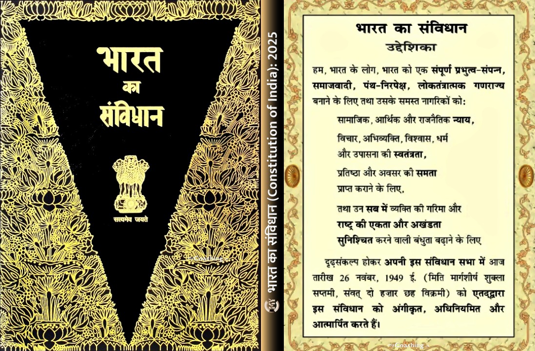 संविधान भारत का सर्वाेच्च कानून है। यह एक लिखित दस्तावेज है जो सरकार और उसके संगठनों के मौलिक बुनियादी संहिता, संरचना, प्रक्रियाओं, शक्तियों और कर्तव्यों और नागरिकों के अधिकारों और कर्तव्यों का निर्धारण करने वाले ढांचे को निर्धारित करता है। इसे 26 नवंबर 1949 को संविधान सभा द्वारा अंगीकृत किया गया था और यह 26 जनवरी 1950 को लागू हुआ। इसको अंगीकृत किये जाने के समय, संविधान में 395 अनुच्छेद और 8 अनुसूचियां थीं और इसमें लगभग 145,000 शब्द थे, जिससे यह अब तक का अंगीकृत किया जाने वाला सबसे लंबा राष्ट्रीय संविधान बन गया। संविधान के प्रत्येक अनुच्छेद पर संविधान सभा के सदस्यों द्वारा बहस की गई, जिनकी संविधान के निर्माण के लिए 2 वर्ष और 11 महीने की अवधि में 11 सत्रों में और 167 दिनों के दौरान बैठक हुई। संविधान की प्रस्तावना भारत को एक संप्रभु, समाजवादी, धर्मनिरपेक्ष और लोकतांत्रिक गणराज्य घोषित करती है और अपने नागरिकों को न्याय, समानता और स्वतंत्रता का आश्वासन देती है और बंधुत्व को बढ़ावा देने का प्रयास करती है। संविधान सरकार के एक संसदीय स्वरूप का प्रावधान करता है जो कुछ एकात्मक विशेषताओं के साथ संरचना में संघीय है। संघ की कार्यकारिणी का संवैधानिक प्रमुख राष्ट्रपति होता है। भारत के संविधान के अनुच्छेद 79 के अनुसार, संघ की संसद की परिषद में राष्ट्रपति और दो सदन होते हैं, जिन्हें कॉउंसिल ऑफ स्टेट्स (राज्य सभा) और हाउस ऑफ द पीपल (लोकसभा) के रूप में जाना जाता है। संविधान के अनुच्छेद 74 (1) में प्रावधान है कि राष्ट्रपति को सहायता और सलाह देने के लिए एक मंत्रिपरिषद होगी जिसका प्रधान, प्रधान मंत्री होगा और राष्ट्रपति अपने कृत्यों का प्रयोग करने में ऐसी सलाह के अनुसार कार्य करेगा। इस प्रकार वास्तविक कार्यकारी शक्ति प्रधान मंत्री की अध्यक्षता वाली मंत्रिपरिषद में निहित होती है।