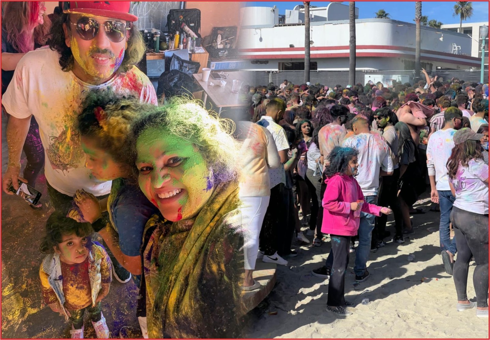 जिसमें देश दुनिया के वहां रहने वाले प्रवासी और स्थानीय लोग भी शामिल होते हैं। मैं वेस्ट हॉलीवुड, लॉस एंजेलस गई। यहां भारतीय कम हैं तो भी वहां लॉन्ग बीच आदि पर महीने में वीकएंड पर, चार बार पर अलग अलग कंपनियों ने अलग-अलग जगह, अलग-अलग दिन होली के त्यौहार का आयोजन किया। हिंदुओं के अलावा और लोग भी आते हैं, तभी तो इतने बड़े कार्यक्रम होते हैं। होली की छुट्टी तो होती नहीं हैं इसलिए होली के दिन त्यौहार न मना कर, लोगों की सुविधा, अनुसार संडे को मना लेते हैं। जो लोग भारत नहीं आ सकते हैं, उनके लिए विदेशों में होली हो जाती है। जमकर रंग खेला जाता है, पारंपरिक व्यंजन खाए जाते हैं। सेल्फी प्वाइंट होते हैं, रंग लगे लोग सपरिवार फोटो लेते हैं। समुद्री रेत पर होली खेली जाती है, धुलाई, सफाई की भी जरूरत नहीं है। संगीत के बिना उत्सव कैसा! विद्वानों का मानना है जो जनजातियाँ नाचती गाती नहीं, उनकी संस्कृति मर जाती है। बॉलीवुड से कलाकार बुलाए जाते हैं। जमकर नाच गाना होता है। प्रोड्यूसर पूजा कोहली तनेजा परिवार क्यूपर्टिनों शहर में रहता है। क्यूपर्टिनों, विश्वप्रसिद्ध सिलिकॉन वैली के पश्चिमी छोर पर सांता क्रूज पर्वत की तलहटी में स्थित है। कैलिफोर्निया का यह शहर एप्पल कम्प्यूटर इंक. और उच्च श्रेणी के पब्लिक स्कूलों के कारण मशहूर है। पूजा परिवार होली के त्यौहार का आयोजन करता है। दिन, मौसम और छुट्टियों के अनुसार तय किया जाता है। जब सबको सुविधा होती है इसलिए पूजा परिवार की होली का सबको इंतजार रहता है। होली भारत से बाहर भी एकता और खुशी का प्रतीक बन गया है। अटलांटिका में इस्कॉन द्वारा होली उत्सव बहुत विशाल स्तर पर मनाया जाता है। हिंदू धर्म की यही तो विशेषता है जो सब को धारण ही नहीं करती बल्कि इसमें लचीली व्यवस्था भी है। भारत में निश्चित दिन और विदेश में सुविधानुसार होली का आनन्द उठाया जाता है।