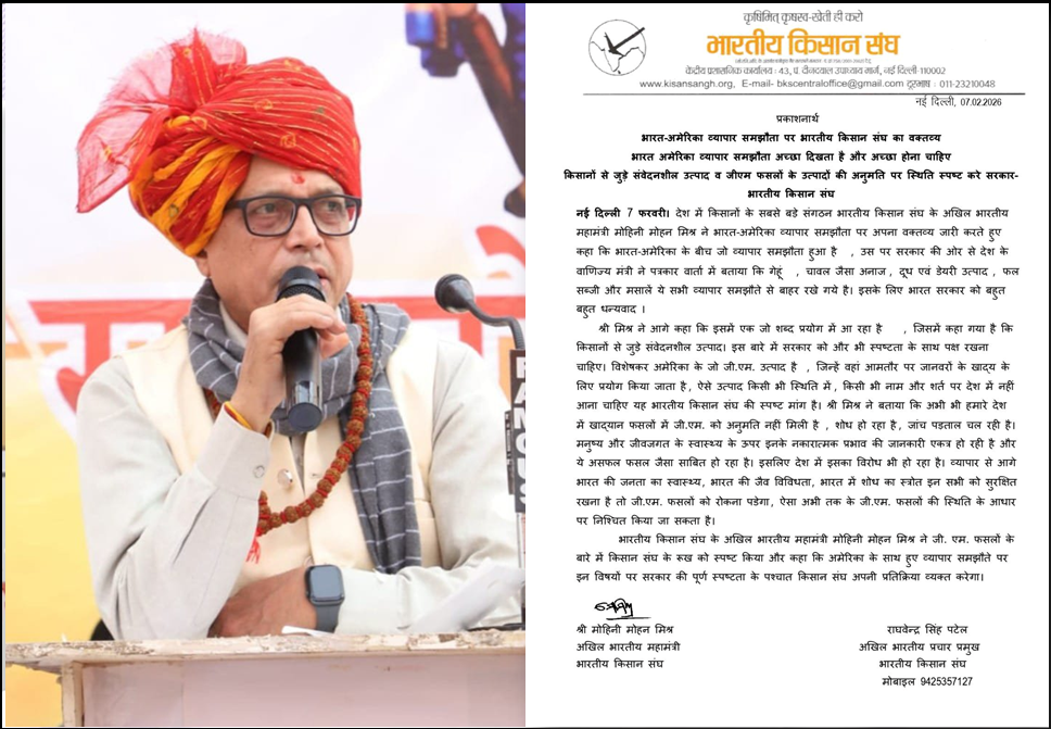 देश में किसानों के सबसे बड़े संगठन भारतीय किसान संघ के अखिल भारतीय महामंत्री मोहिनी मोहन मिश्र ने भारत-अमेरिका व्यापार समझौता पर कहा कि भारत-अमेरिका के बीच हुए व्यापार समझौते को लेकर सरकार की ओर से वाणिज्य मंत्री ने पत्रकार वार्ता में बताया कि गेहूं, चावल जैसा अनाज, दूध एवं डेयरी उत्पाद, फल सब्जी और मसाले, ये सभी व्यापार समझौते से बाहर रखे गए हैं।