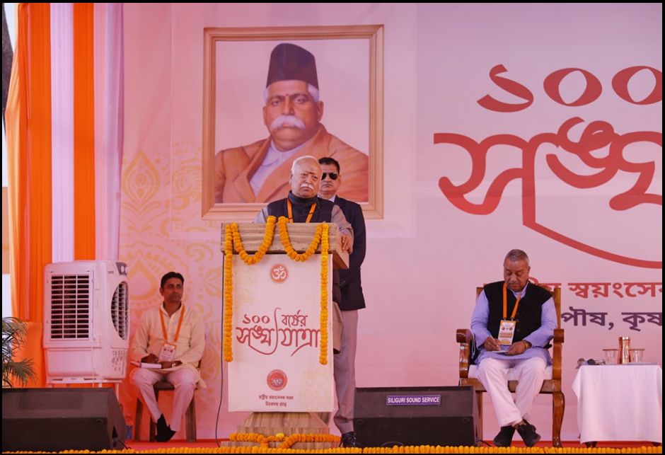 “स्वस्ति मंत्र” के साथ कार्यक्रम के प्रथम सत्र का शुभारंभ होने के पश्चात राष्ट्रीय स्वयंसेवक संघ के सरसंघचालक मोहन भागवत जी, सह सरकार्यवाह रामदत्त चक्रधर जी एवं उत्तर बंगाल प्रांत संघचालक हृषिकेश साहा जी ने भारत माता के चित्र पर पुष्पार्चन किया। उनके मंचासीन होने के उपरांत उपस्थित युवक-युवतियों ने द्विजेंद्रलाल राय की रचना ‘धन-धान्य पुष्पभरा’ का सामूहिक गायन किया। परंपरागत परिचय सत्र के बाद सरसंघचालक जी ने युवक-युवतियों को संबोधित किया। युवा सम्मेलन में सरसंघचालक डॉ. मोहन भागवत जी ने कहा –