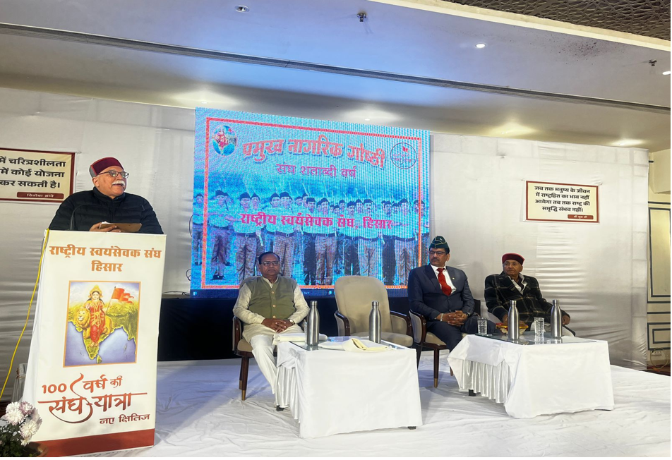 राष्ट्रीय स्वयंसेवक संघ के शताब्दी वर्ष के उपलक्ष्य में पंजाबी भवन, हिसार में प्रमुख नागरिक गोष्ठी का आयोजन हुआ। कार्यक्रम का शुभारंभ दीप प्रज्ज्वलन एवं “वंदे मातरम्” के सामूहिक गायन से हुआ।