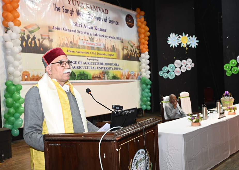 वे इरोइसेम्बा स्थित कृषि महाविद्यालय के सभागार में "संघ का मार्ग: 100 वर्ष की सेवा" विषय पर आयोजित युवा संवाद कार्यक्रम को संबोधित कर रहे थे। मुख्य अतिथि और प्रमुख वक्ता के रूप में, अरुण कुमार जी ने भारत को एक जीवंत सभ्यता के रूप में वर्णित किया, जो अपनी अटूट सांस्कृतिक निरंतरता और सभ्यतागत गहराई में अद्वितीय है।