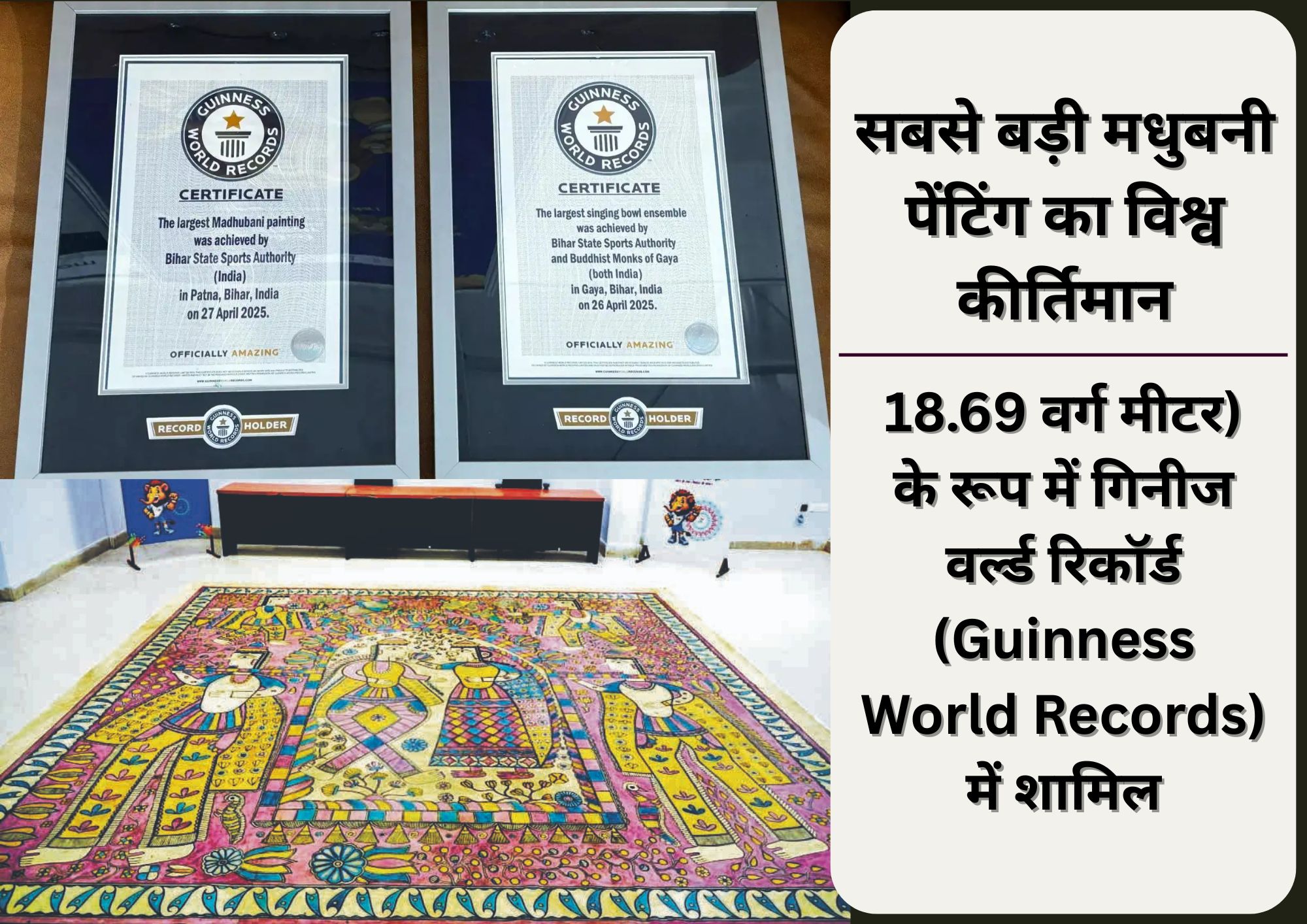 रविवार 27 अप्रैल को पटना में गिनीज वर्ल्ड रिकॉर्ड के अधिकारियों ने बिहार के मुख्यमंत्री नीतीश कुमार को बिहार स्पोर्ट्स ऑथोरिटी द्वारा तैयार मधुबनी पेंटिंग (18.69 वर्ग मीटर) के लिए सर्टिफिकेट प्रदान किया। तीन दिनों में प्राकृतिक रंगों से निर्मित यह कलाकृति बिहार की सांस्कृतिक विरासत के लिए एक गौरवपूर्ण क्षण है।
